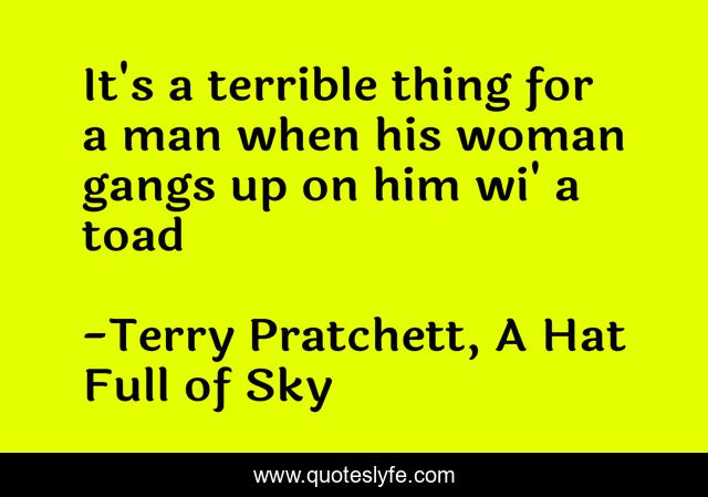 This page presents the quote "It's a terrible thing for a man when his woman gangs up on him wi' a toad". Author of this quote is Terry Pratchett, A Hat Full of Sky. This quote is about humor, toads, marriage, husband, wife,.