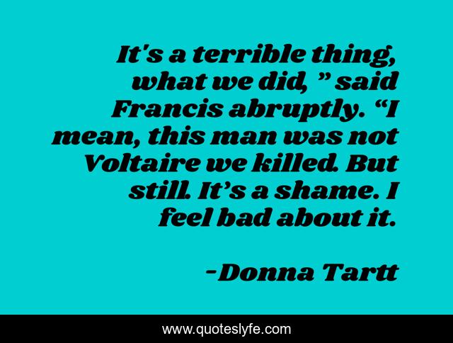 This page presents the quote "It's a terrible thing, what we did, ” said Francis abruptly. “I mean, this man was not Voltaire we killed. But still. It’s a shame. I feel bad about it.". Author of this quote is Donna Tartt. This quote is about murder, humor,.