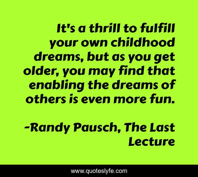 This page presents the quote "It's a thrill to fulfill your own childhood dreams, but as you get older, you may find that enabling the dreams of others is even more fun.". Author of this quote is Randy Pausch, The Last Lecture. This quote is about childhood-dream, advice, life-lessons,.