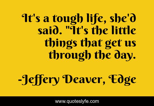 This page presents the quote "It's a tough life, she'd said. "It's the little things that get us through the day.". Author of this quote is Jeffery Deaver, Edge. This quote is about life-lesson, edge, little-things,.