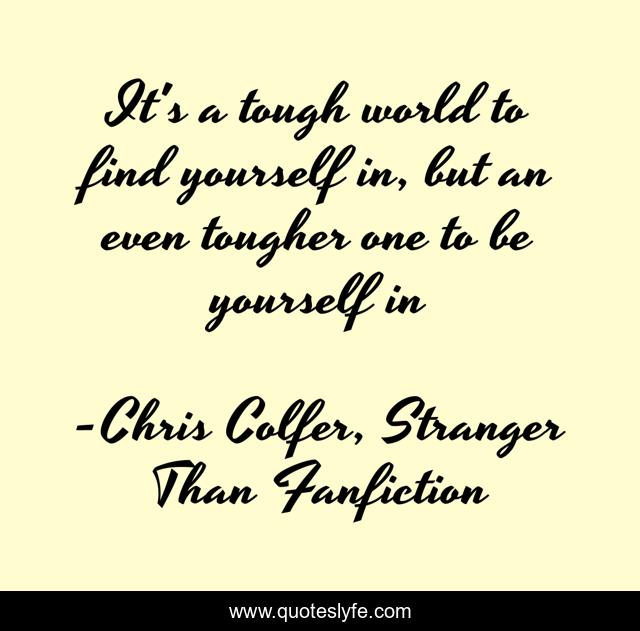 This page presents the quote "It's a tough world to find yourself in, but an even tougher one to be yourself in". Author of this quote is Chris Colfer, Stranger Than Fanfiction. This quote is about coming-of-age, fiction, inspiring, transgender,.