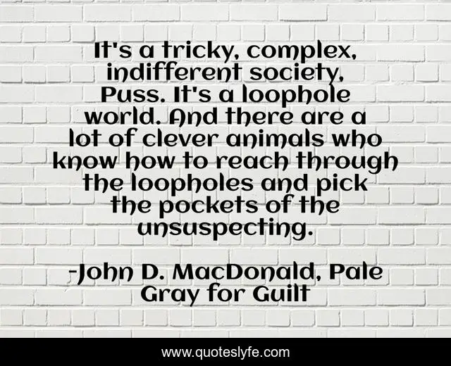This page presents the quote "It's a tricky, complex, indifferent society, Puss. It's a loophole world. And there are a lot of clever animals who know how to reach through the loopholes and pick the pockets of the unsuspecting.". Author of this quote is John D. MacDonald, Pale Gray for Guilt. This quote is about justice, world, salvage-consultancy,.