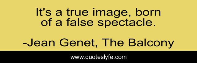 This page presents the quote "It's a true image, born of a false spectacle.". Author of this quote is Jean Genet, The Balcony. This quote is about drama, fiction, reality,.