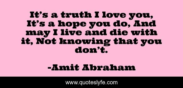 This page presents the quote "It’s a truth I love you, It’s a hope you do, And may I live and die with it, Not knowing that you don’t.". Author of this quote is Amit Abraham. This quote is about hope, love, truth, affection,.