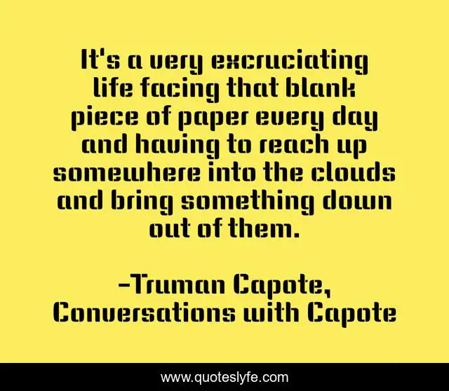 This page presents the quote "It's a very excruciating life facing that blank piece of paper every day and having to reach up somewhere into the clouds and bring something down out of them.". Author of this quote is Truman Capote, Conversations with Capote. .