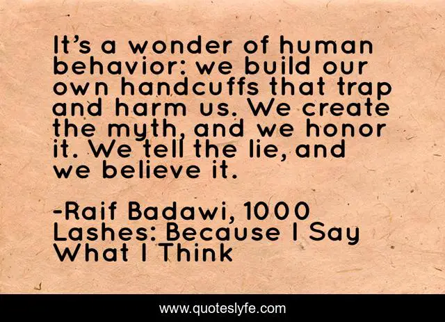 This page presents the quote "It’s a wonder of human behavior: we build our own handcuffs that trap and harm us. We create the myth, and we honor it. We tell the lie, and we believe it.". Author of this quote is Raif Badawi, 1000 Lashes: Because I Say What I Think. This quote is about denial, psychology, myth, religion, humanity, society, truth, tradition, belief,.