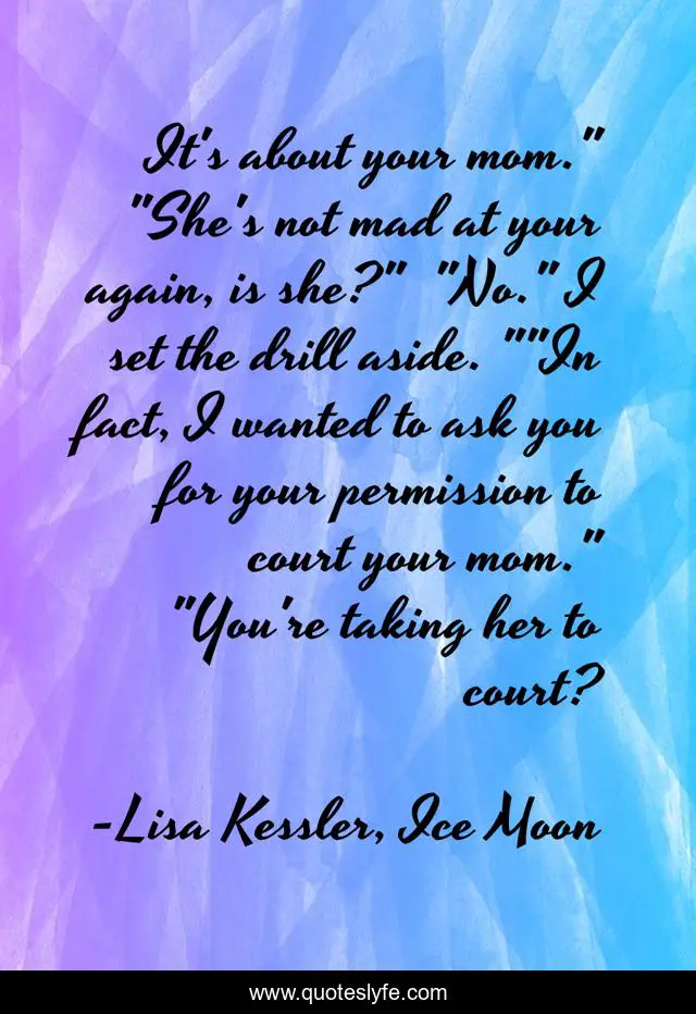 This page presents the quote "It's about your mom." "She's not mad at your again, is she?" "No." I set the drill aside. ""In fact, I wanted to ask you for your permission to court your mom." "You're taking her to court?". Author of this quote is Lisa Kessler, Ice Moon. .