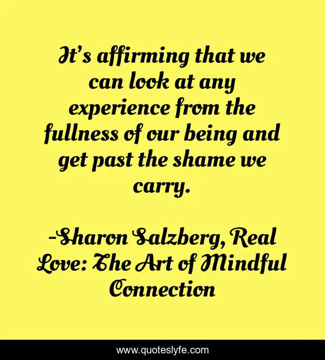 This page presents the quote "It’s affirming that we can look at any experience from the fullness of our being and get past the shame we carry.". Author of this quote is Sharon Salzberg, Real Love: The Art of Mindful Connection. This quote is about love, mindfulness, shame, meditation, real-love, affection,.
