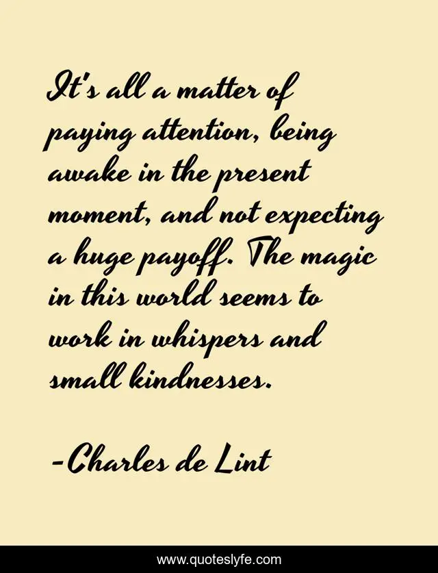 This page presents the quote "It's all a matter of paying attention, being awake in the present moment, and not expecting a huge payoff. The magic in this world seems to work in whispers and small kindnesses.". Author of this quote is Charles de Lint. This quote is about kindness, magic, awareness,.