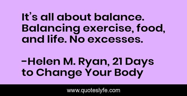 This page presents the quote "It’s all about balance. Balancing exercise, food, and life. No excesses.". Author of this quote is Helen M. Ryan, 21 Days to Change Your Body. This quote is about health, balance, mind-body, weightloss,.