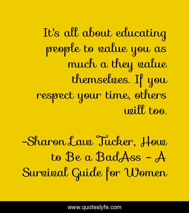 This page presents the quote "It's all about educating people to value you as much a they value themselves. If you respect your time, others will too.". Author of this quote is Sharon Law Tucker, How to Be a BadAss - A Survival Guide for Women. This quote is about live-coach, confidence, empowerment, self-improvement,.