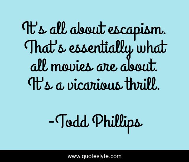 This page presents the quote "It's all about escapism. That's essentially what all movies are about. It's a vicarious thrill.". Author of this quote is Todd Phillips. This quote is about escapism, thrill,.