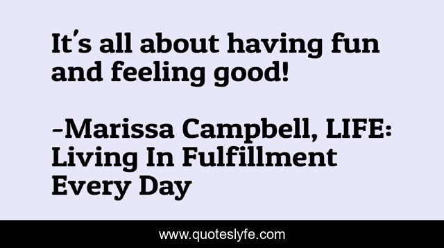 This page presents the quote "It's all about having fun and feeling good!". Author of this quote is Marissa Campbell, LIFE: Living In Fulfillment Every Day. This quote is about spirituality, life, self-help, inspirational, enthusiasm,.