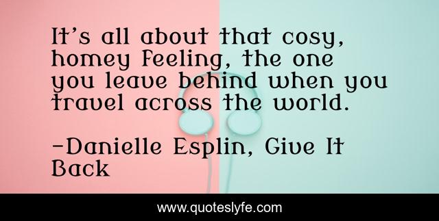 This page presents the quote "It’s all about that cosy, homey feeling, the one you leave behind when you travel across the world.". Author of this quote is Danielle Esplin, Give It Back. This quote is about homesick, travel, culture, au-pair, world, home,.