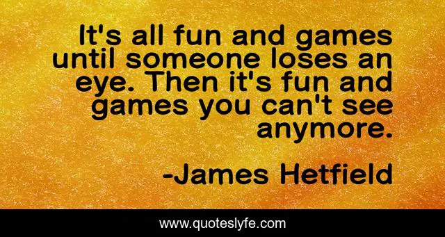 This page presents the quote "It's all fun and games until someone loses an eye. Then it's fun and games you can't see anymore.". Author of this quote is James Hetfield. This quote is about funny, humor, humour, comedy, dark-humor, metallica,.