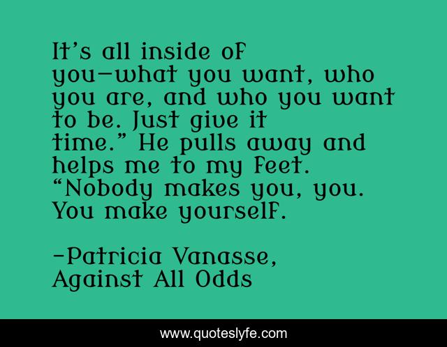 This page presents the quote "It’s all inside of you—what you want, who you are, and who you want to be. Just give it time.” He pulls away and helps me to my feet. “Nobody makes you, you. You make yourself.". Author of this quote is Patricia Vanasse, Against All Odds. This quote is about against-all-oods, young-adult, patricia-vanasse,.
