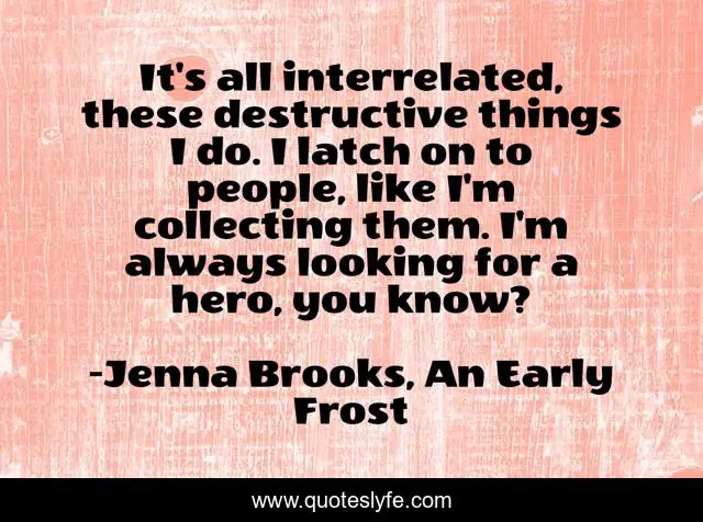 "Jenna Brooks, An Early Frost Quotes." Quoteslyfe.com, 2025. Fri. 05 Dec. 2025. <https://www.quoteslyfe.com/quote/It-s-all-interrelated-these-destructive-things-218027>.