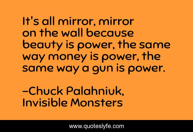 This page presents the quote "It's all mirror, mirror on the wall because beauty is power, the same way money is power, the same way a gun is power.". Author of this quote is Chuck Palahniuk, Invisible Monsters. This quote is about beauty, power,.