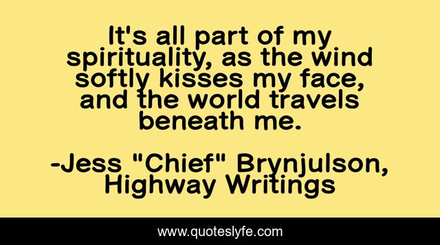 This page presents the quote "It's all part of my spirituality, as the wind softly kisses my face, and the world travels beneath me.". Author of this quote is Jess "Chief" Brynjulson, Highway Writings. This quote is about spirituality, biker, bike, travel, world,.