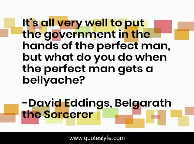 This page presents the quote "It's all very well to put the government in the hands of the perfect man, but what do you do when the perfect man gets a bellyache?". Author of this quote is David Eddings, Belgarath the Sorcerer. This quote is about tyranny, politics, humor,.