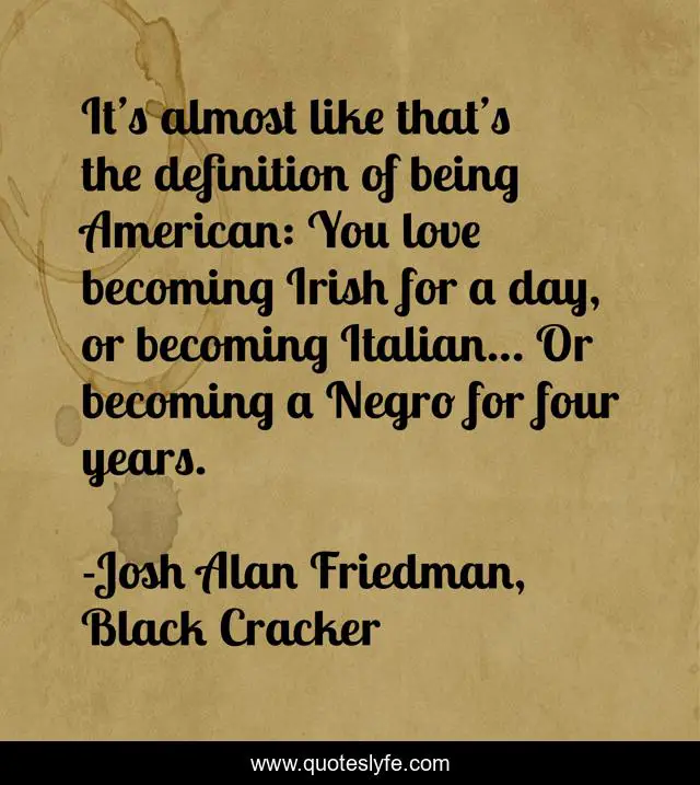 This page presents the quote "It’s almost like that’s the definition of being American: You love becoming Irish for a day, or becoming Italian… Or becoming a Negro for four years.". Author of this quote is Josh Alan Friedman, Black Cracker. This quote is about american, race, holidays, melting-pot,.