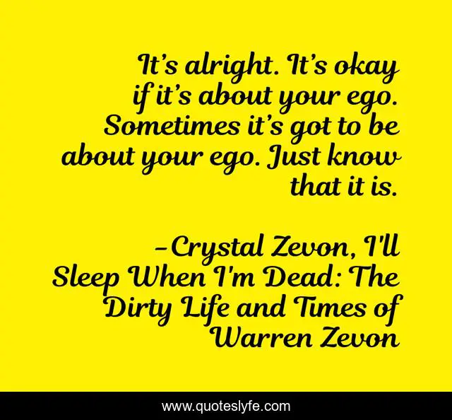 This page presents the quote "It’s alright. It’s okay if it’s about your ego. Sometimes it’s got to be about your ego. Just know that it is.". Author of this quote is Crystal Zevon, I'll Sleep When I'm Dead: The Dirty Life and Times of Warren Zevon. This quote is about ego, egotism, warren-zevon,.