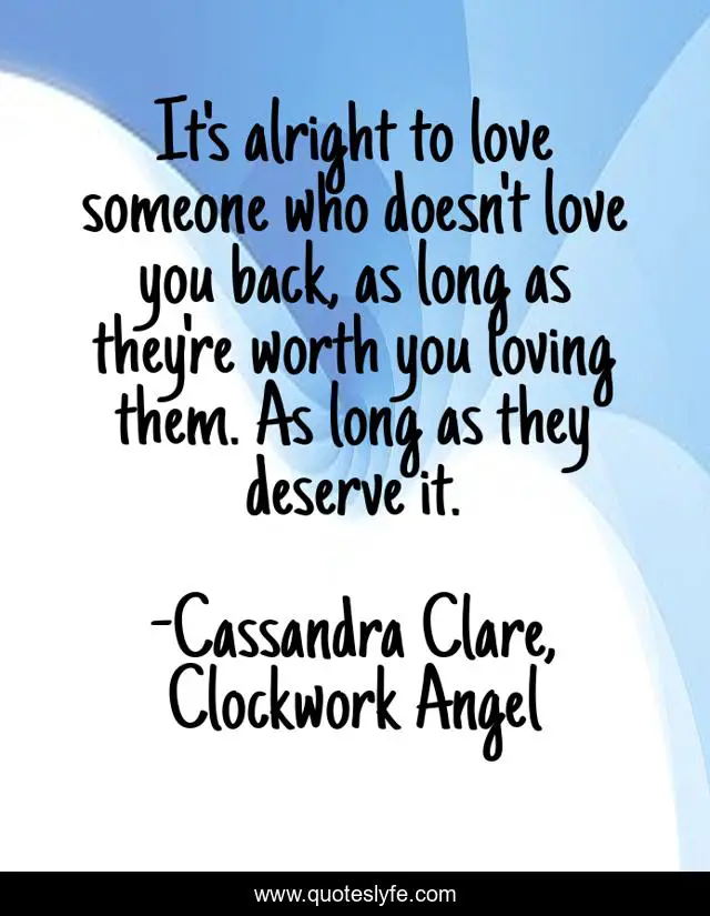 This page presents the quote "It's alright to love someone who doesn't love you back, as long as they're worth you loving them. As long as they deserve it.". Author of this quote is Cassandra Clare, Clockwork Angel. This quote is about faith, life, love, angel, loneliness, sad, romance, journey, books,.