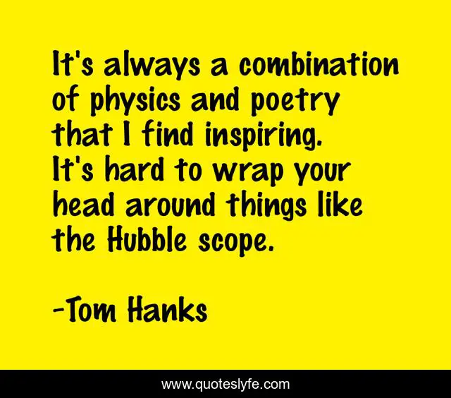 This page presents the quote "It's always a combination of physics and poetry that I find inspiring. It's hard to wrap your head around things like the Hubble scope.". Author of this quote is Tom Hanks. This quote is about head, physics, find,.