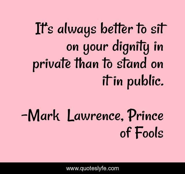 This page presents the quote "It’s always better to sit on your dignity in private than to stand on it in public.". Author of this quote is Mark Lawrence, Prince of Fools. This quote is about dignity, sit, stand, private, public,.