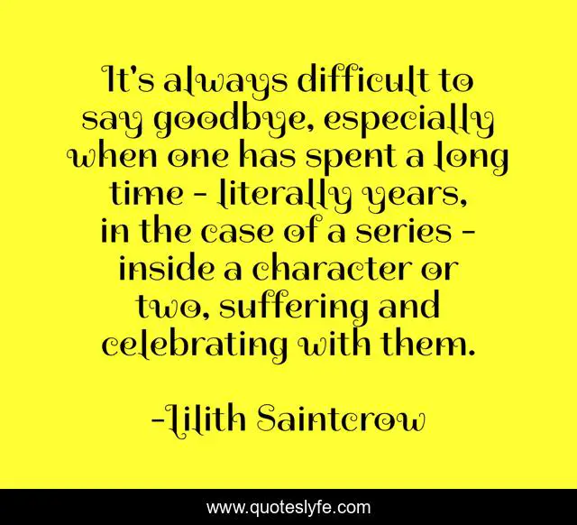 This page presents the quote "It's always difficult to say goodbye, especially when one has spent a long time - literally years, in the case of a series - inside a character or two, suffering and celebrating with them.". Author of this quote is Lilith Saintcrow. This quote is about character, goodbye,.