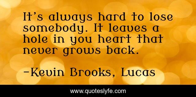 This page presents the quote "It’s always hard to lose somebody. It leaves a hole in you heart that never grows back.". Author of this quote is Kevin Brooks, Lucas. This quote is about loss, wisdom,.