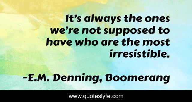 This page presents the quote "It’s always the ones we’re not supposed to have who are the most irresistible.". Author of this quote is E.M. Denning, Boomerang. This quote is about romance-novel, love, temptation, romance, quotes, affection, irresistible,.