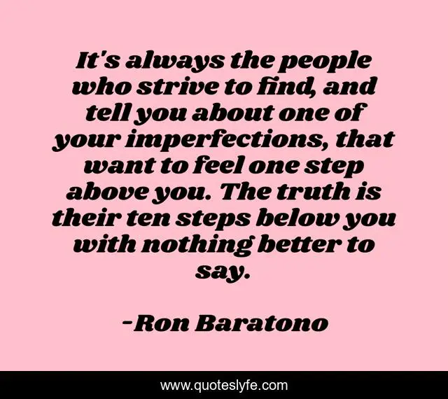 This page presents the quote "It's always the people who strive to find, and tell you about one of your imperfections, that want to feel one step above you. The truth is their ten steps below you with nothing better to say.". Author of this quote is Ron Baratono. This quote is about insult, imperfection, truth, people,.