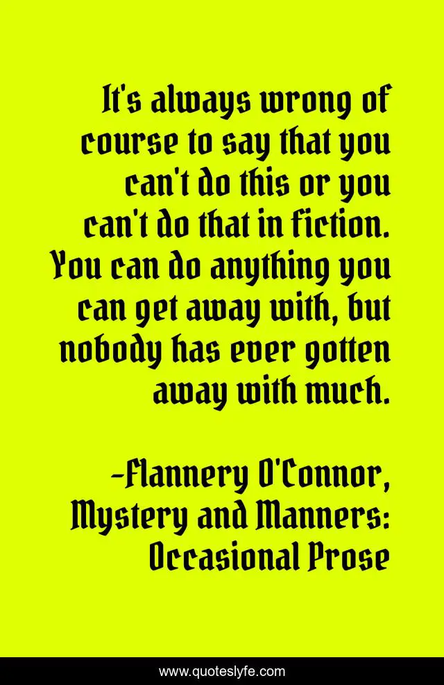 This page presents the quote "It's always wrong of course to say that you can't do this or you can't do that in fiction. You can do anything you can get away with, but nobody has ever gotten away with much.". Author of this quote is Flannery O'Connor, Mystery and Manners: Occasional Prose. This quote is about fiction-writing, writers-on-writing, writing-fiction, writing-style, writing,.