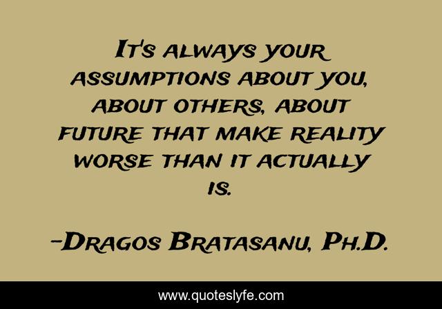 This page presents the quote "It's always your assumptions about you, about others, about future that make reality worse than it actually is.". Author of this quote is Dragos Bratasanu, Ph.D.. This quote is about life, inspirational, wisdom, assumptions, life-lessons, enthusiasm, reality,.