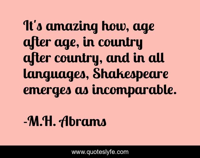 This page presents the quote "It's amazing how, age after age, in country after country, and in all languages, Shakespeare emerges as incomparable.". Author of this quote is M.H. Abrams. This quote is about culture, literature,.