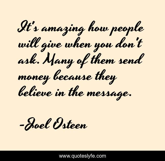 This page presents the quote "It's amazing how people will give when you don't ask. Many of them send money because they believe in the message.". Author of this quote is Joel Osteen. This quote is about money, believe, people,.