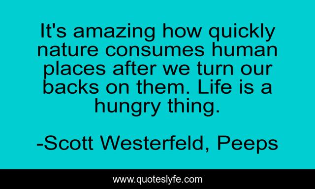 This page presents the quote "It's amazing how quickly nature consumes human places after we turn our backs on them. Life is a hungry thing.". Author of this quote is Scott Westerfeld, Peeps. This quote is about scott-westerfeld, life, scott-la, peeps,.