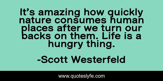 This page presents the quote "It’s amazing how quickly nature consumes human places after we turn our backs on them. Life is a hungry thing.". Author of this quote is Scott Westerfeld. .