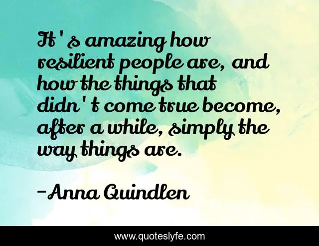 This page presents the quote "It's amazing how resilient people are, and how the things that didn't come true become, after a while, simply the way things are.". Author of this quote is Anna Quindlen. This quote is about life, life-and-living, plans,.