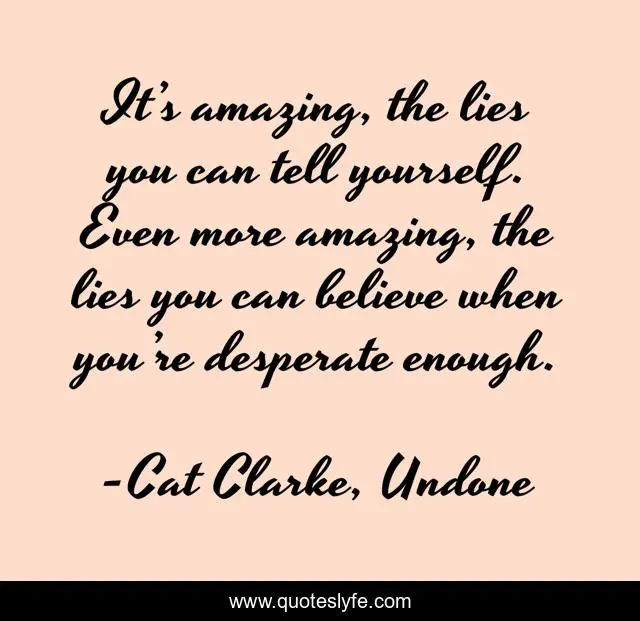 This page presents the quote "It’s amazing, the lies you can tell yourself. Even more amazing, the lies you can believe when you’re desperate enough.". Author of this quote is Cat Clarke, Undone. This quote is about lies, persuasion, yourself,.