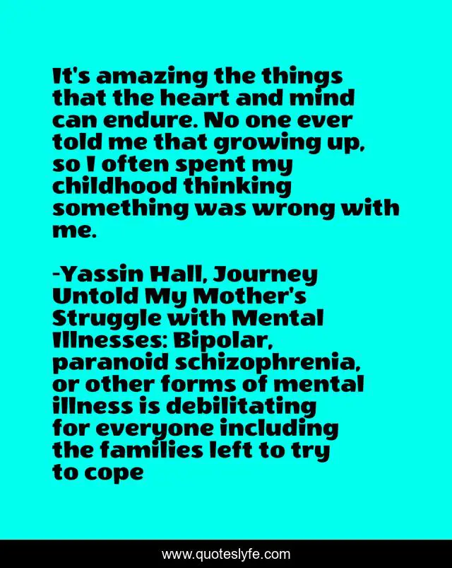 "Yassin Hall, Journey Untold My Mother's Struggle with Mental Illnesses: Bipolar, paranoid schizophrenia, or other forms of mental illness is debilitating for everyone including the families left to try to cope Quotes." Quoteslyfe.com, 2025. Mon. 08 Dec. 2025. <https://www.quoteslyfe.com/quote/It-s-amazing-the-things-that-the-114092>.