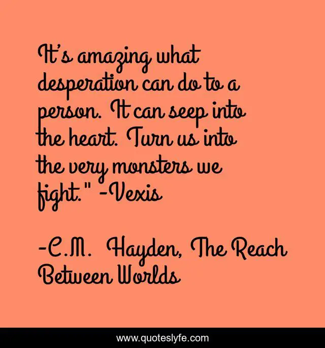 This page presents the quote "It’s amazing what desperation can do to a person. It can seep into the heart. Turn us into the very monsters we fight." -Vexis". Author of this quote is C.M. Hayden, The Reach Between Worlds. This quote is about magic, saga, magister, evil, fantasy, arclight, sorceress, epic,.