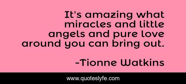 This page presents the quote "It's amazing what miracles and little angels and pure love around you can bring out.". Author of this quote is Tionne Watkins. This quote is about love, angels, affection,.