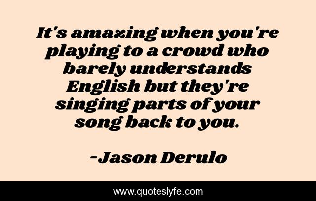 This page presents the quote "It's amazing when you're playing to a crowd who barely understands English but they're singing parts of your song back to you.". Author of this quote is Jason Derulo. This quote is about singing, song,.