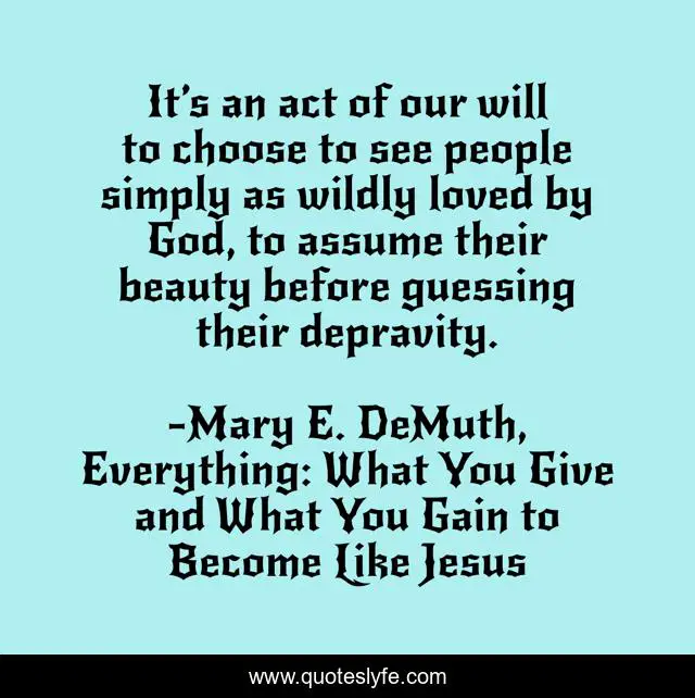 This page presents the quote "It’s an act of our will to choose to see people simply as wildly loved by God, to assume their beauty before guessing their depravity.". Author of this quote is Mary E. DeMuth, Everything: What You Give and What You Gain to Become Like Jesus. This quote is about love, willingness, beauty, god, acceptance, choice, judgement, religion, depravity,.