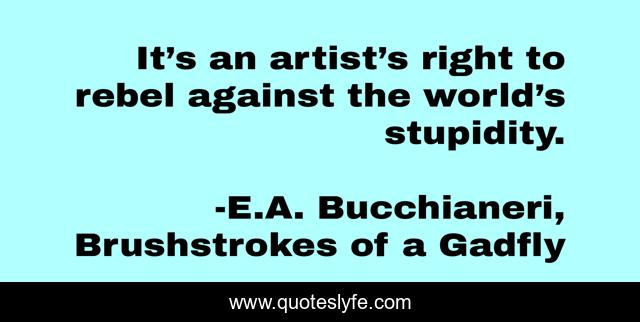 This page presents the quote "It’s an artist’s right to rebel against the world’s stupidity.". Author of this quote is E.A. Bucchianeri, Brushstrokes of a Gadfly. This quote is about art, rights, artist, creativity, gadfly, rebellion, arts-and-humanities, stupidity, rights-and-duties,.