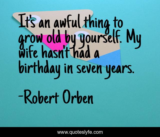 This page presents the quote "It's an awful thing to grow old by yourself. My wife hasn't had a birthday in seven years.". Author of this quote is Robert Orben. This quote is about age, birthdays,.