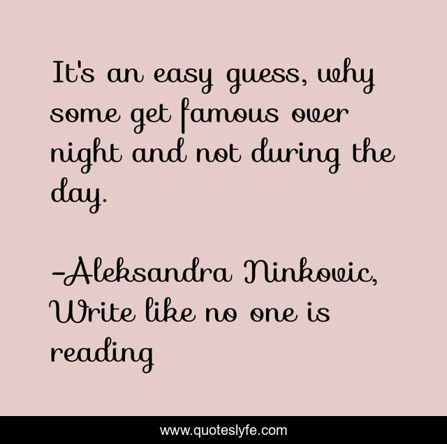 This page presents the quote "It's an easy guess, why some get famous over night and not during the day.". Author of this quote is Aleksandra Ninkovic, Write like no one is reading. This quote is about clever, lost, searching, famous, wit, rich, night, day, smart,.