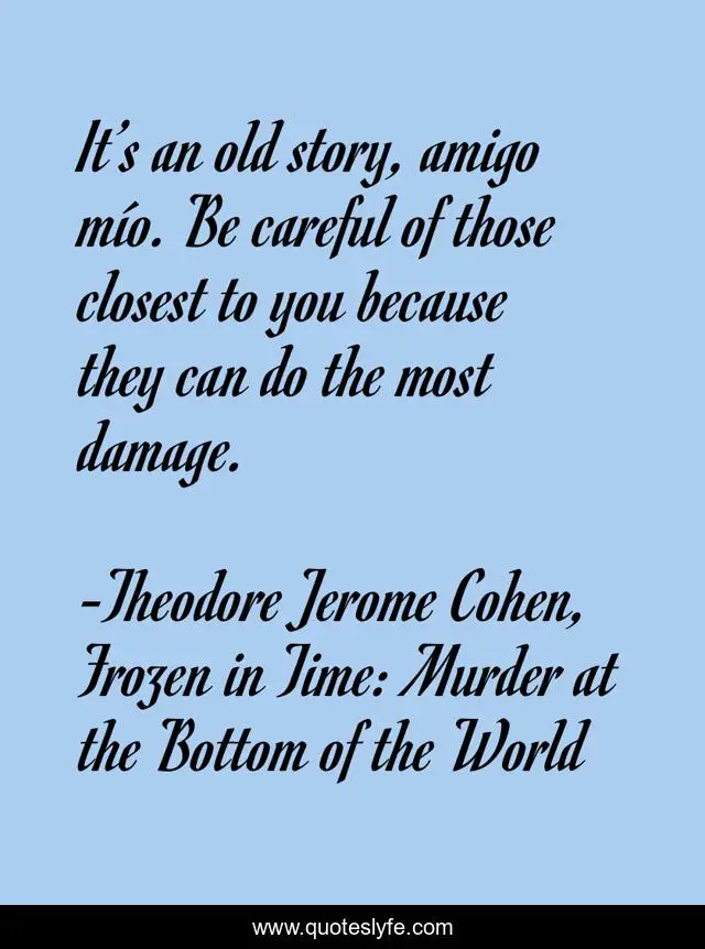 This page presents the quote "It’s an old story, amigo mío. Be careful of those closest to you because they can do the most damage.". Author of this quote is Theodore Jerome Cohen, Frozen in Time: Murder at the Bottom of the World. This quote is about murder, o-higgins, antarctica, suspense, chile, thriller,.
